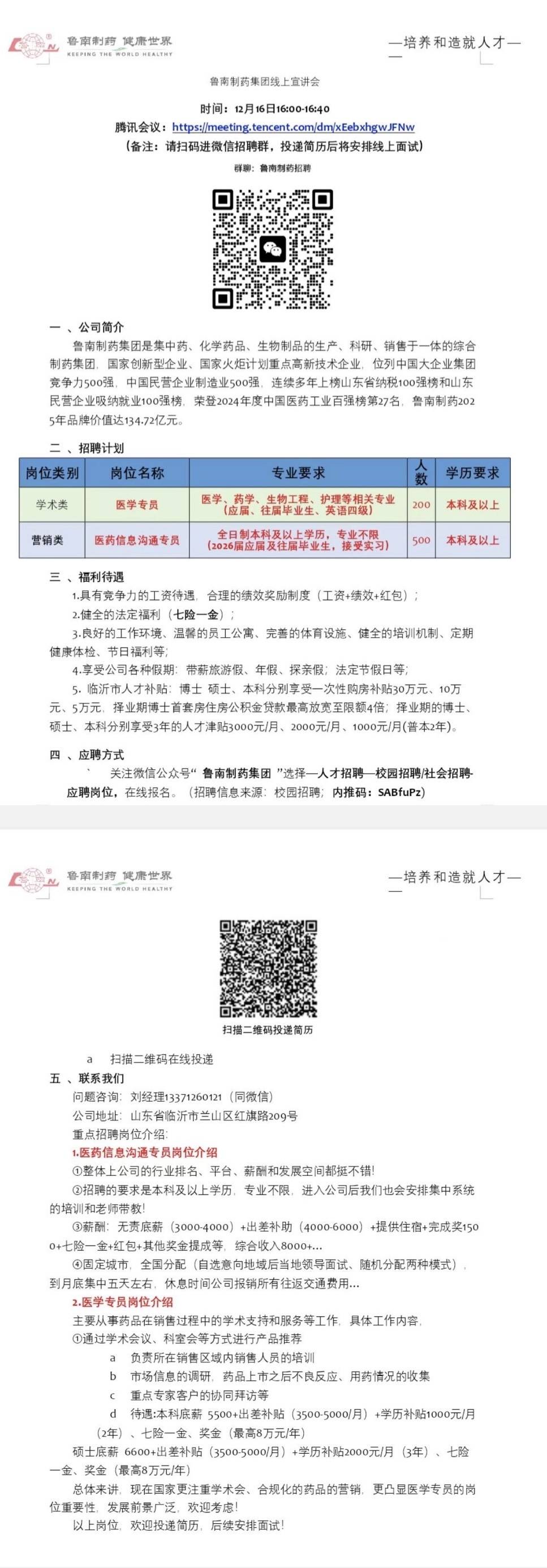 宣讲主题:鲁南制药集团线上宣讲