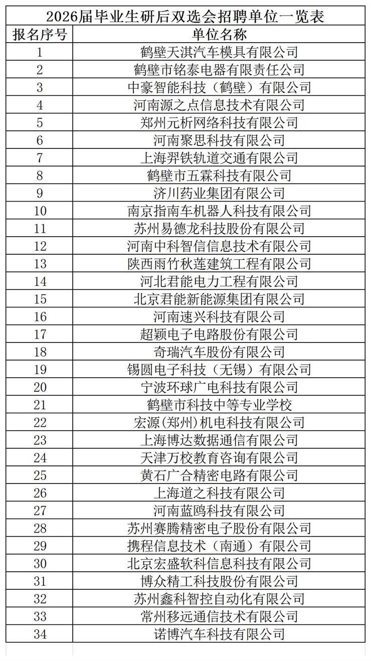 感谢贵单位报名参加我校2026届毕业生研后双选会。为确保活动顺利开展,现将参会具体安排及注意事项通知如下: